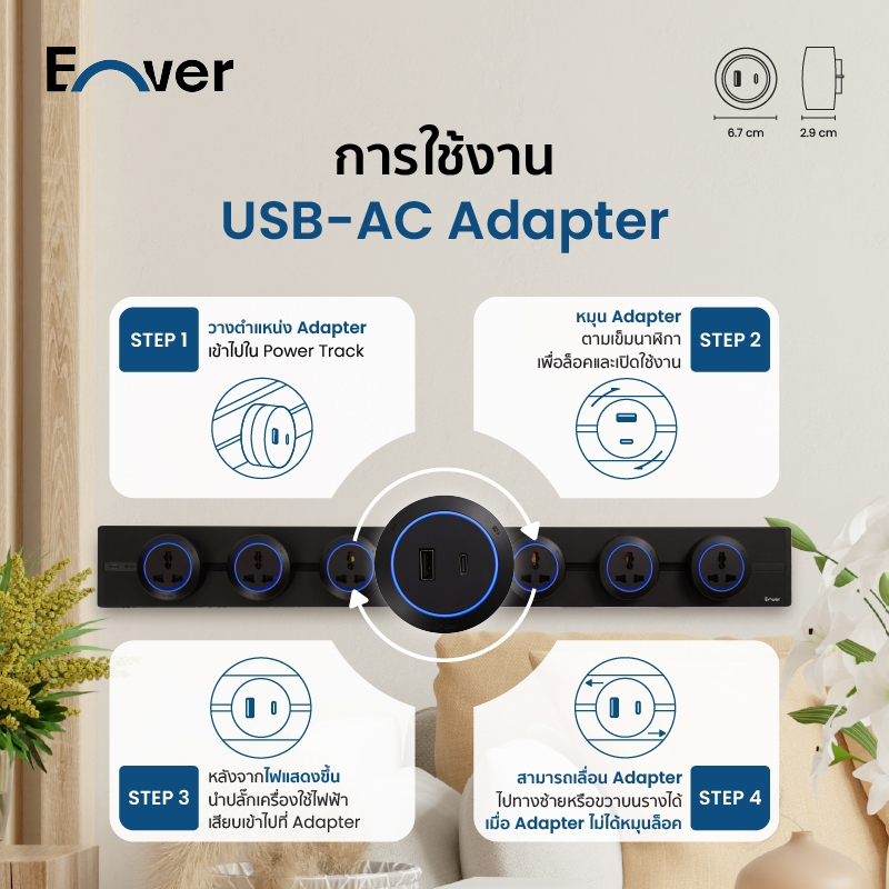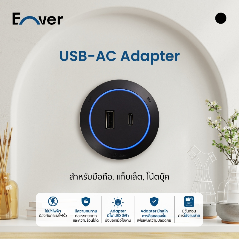USB Adapter Type-AC คืออุปกรณ์เสริมที่เปลี่ยนรางปลั๊กไฟ Enver ให้กลายเป็นจุดชาร์จอุปกรณ์ดิจิทัลได้ทันที ไม่ต้องใช้หัวชาร์จแยกอีกต่อไป